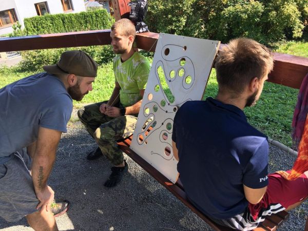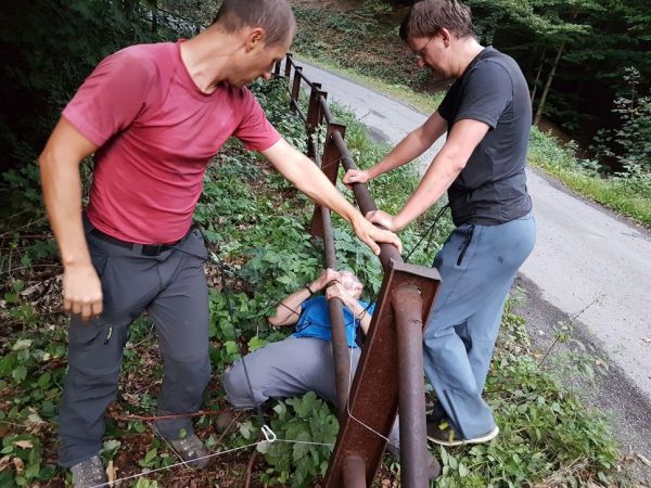 V Beskydech sice žádnou opravdovou ferratu nemáme, ale za to máme Radhošť. A spoustu strmých roklí a propustků. Aktivita Radhošťská ferrata se odehrávala na Sašině cestě, na severním svahu Radhoště, asi 1km od Pindule. Závodníci se pomocí smyček z pružného lana navázali za sebe do vláčku a první z vláčku v čele svůj konec smyčky s karabinkou nacvaknul na vodící špagát. Úkolem aktivity bylo sledovat špagát jako Ariadninu niť a projít všemi překážkami, aniž by se vláček závodníků kdekoliv po cestě rozpojil. Takto absolvovali průlez zábradlím, asi 15x tam i zpět všemožnými způsoby a otvory, slalom mezi stromy na strmém svahu, proběhnutí potokem a na závěr průlez propustkem asi 10m dlouhým. Aktivita prověřila především soudržnost a koordinaci týmu, v kombinaci s obratností a odolností vůči kopřivám.