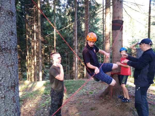 Princip aktivity Zem je láva zná snad úplně každý a kdo ne, měl velmi smutné dětství. Snad všichni si někdy hráli na to, že se nesmí dotknout země a k pohybu se tak musí použít vše vyvýšené, ať už jde o nábytek v bytě, prolézačky na hřišti a nebo stromy a kmeny v lese. A stejný princip jsme využili i my, jen kromě pevných kotevních bodů (no pevných jak kdy, první tým na stanovišti by mohl vyprávět, jak shořel v pekle) dostali závodníci ocelové tyče délky 2,5m, v dětské verzi pak dřevěné koláče. Úkolem závodníků bylo překonat určenou trasu, aniž by se dotkli země a cestu po kmenech stromů si před sebou stavět a za sebou zase rozebírat, neboť tyčí bylo jen o jednu více než členů týmů. Aktivita pro týmovou spolupráci a tréning rovnováhy jako dělaná.