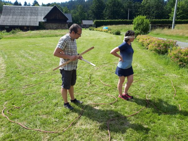 V rámci inkluzivních snah jsme zavedli i disciplínu pro zrakově a řečově znevýhodněné. Minotaurus v našem podání oslepnul, asi z té věčné tmy v bludišti a Théseus zase oněměl, nejspíše krásou Ariadny. Bludiště bylo nakreslené křídou na zemi a Théseus neměl za úkol Minotaura zabít, ale vyvést z bludiště jen za pomoci zvuku zvonečku místo nitě. Trochu jsme to domotali, pravda, ale o to právě šlo. Závodníci se museli na začátku domluvit na způsobu komunikace a dále už nevydat ani hlásku. Minotaurus nesměl ani kouskem podrážky přešlápnout čáru bludiště, jedna chyba a byl konec pokusu. Týmy volily různou taktiku i rychlost postupu, ale vždy platilo, že kdo se v neztratí v bludišti, ten se ani v závodu Brázda neztratí.