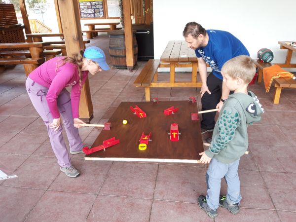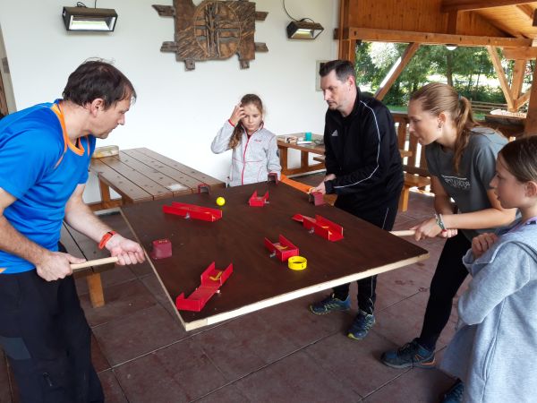 Kdo se někdy neocitnul na šikmé ploše, ať hodí golfovým míčkem. Jak je něco kulaté, hrozí to zábavou a když se přidá pár záludných překážek a držadlo k naklánění roviny, je úspěch zaručen. Úkolem závodníků bylo prokutálet golfový míček po dané trase s několika překážkami na velké dřevěné desce jen nakláněním za tři držadla, zákeřně rozmístěná do trojúhelníku. Míček samozřejmě nesměl spadnout na zem, ale aby to nebylo tak těžké, byly k dispozici 4 domečky, kam se mohl míček po pádu vrátit. Nalézt správnou taktiku pro ovládání míčku nebylo snadné, ale úspěšnější byly týmy, které pochopily, že čím více se deskou máchá ze strany na stranu, tím divočeji míček poskakuje až poletuje, Zkrátka to chtělo klid a rozmysl. Ale vykládejte to někomu, kdo v raných devadesátkách mlátil do automatu s pinballem vší silou a utápěl v něm skromné kapesné.
